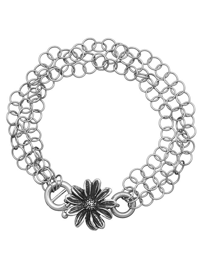 Questo è un bracciale leggero ma decorativo e fa parte della linea Margherite. E´ formato da tre catenelle a maglia rotonda che si raccolgono in una chiusura a forma di margherita. Lunghezza cm. 18