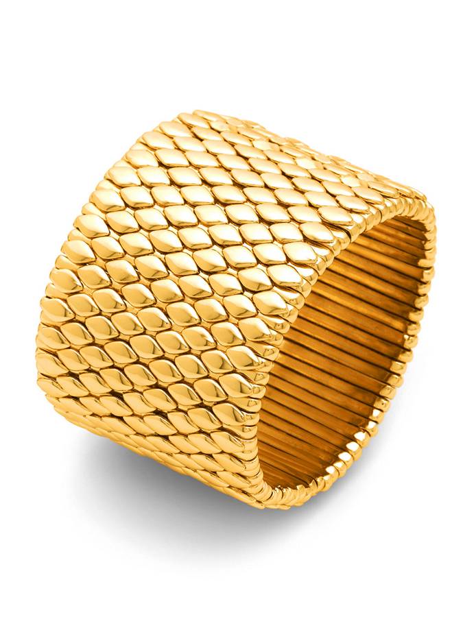 Un bracciale di grande impatto, dalla texture dinamica e contemporanea, molto luminoso. La presenza di due molle interne nascoste garantisce una vestibilità confortevole. E´ un gioiello fatto a mano, espressione di grande maestria artigianale. Altezza della fascia 4,6 cm