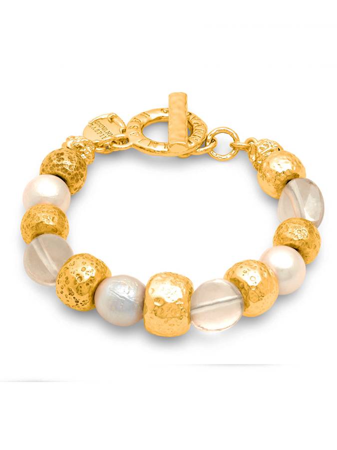 Questo raffinato bracciale elementi in bronzo martellato dorato, perle naturali d´acqua dolce e segmenti in cristallo di rocca. Munito di comoda chisura a T - bar con medesima finitura martellatata. Lavorato a mano a cera persa, misura 21 cm.