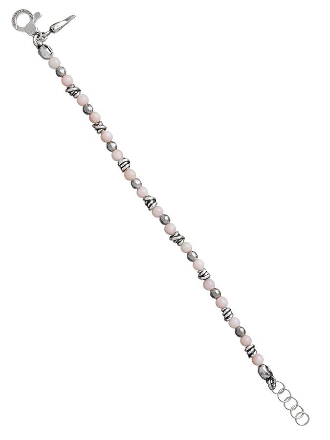Piccoli elementi in argento brunito, alternati alle sferette in opale rosa, rendono questo bracciale un piccolo capolavoro di eleganza contemporanea. Lunghezza cm. 19