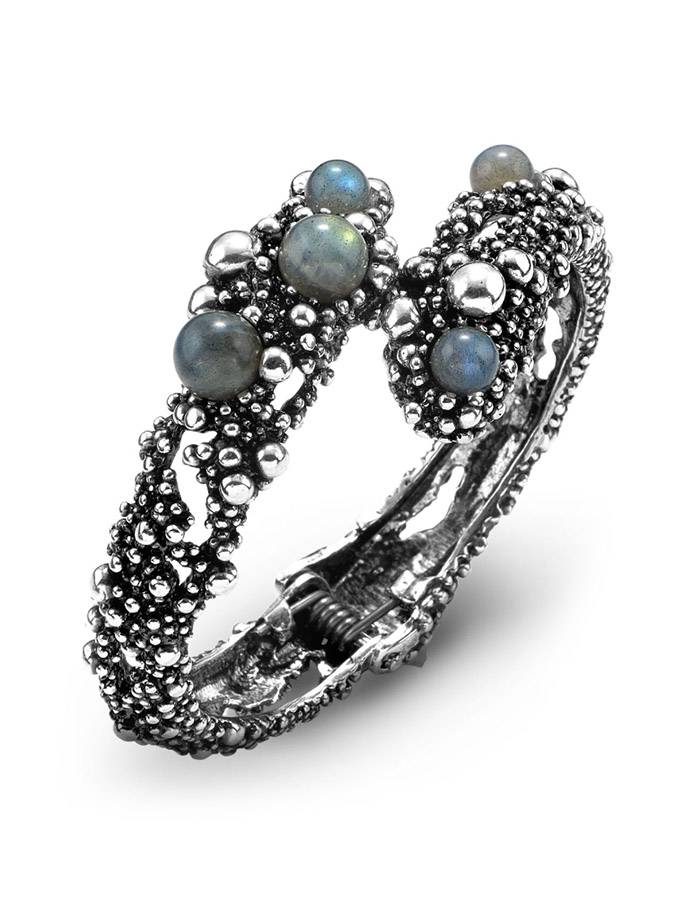 Un flusso di sferette in argento lucido, su fondo brunito, che si rincorrono in un gioco luminoso di texture e opalescenze, realizzate grazie all´utilizzo della labradorite e dei suoi riflessi cangianti, dal grigio all´azzurro, sino al blu.
