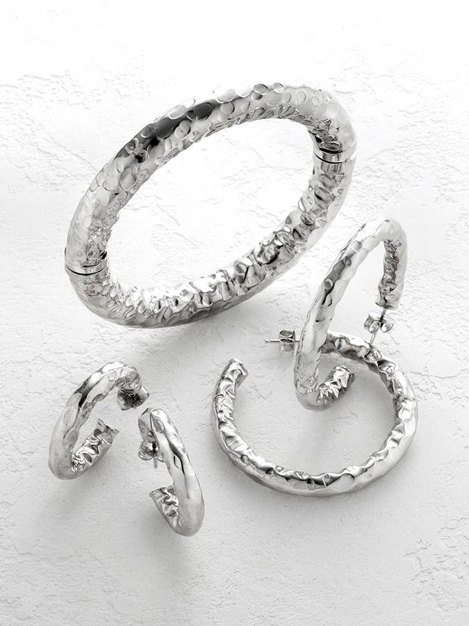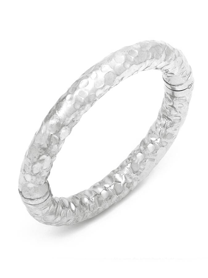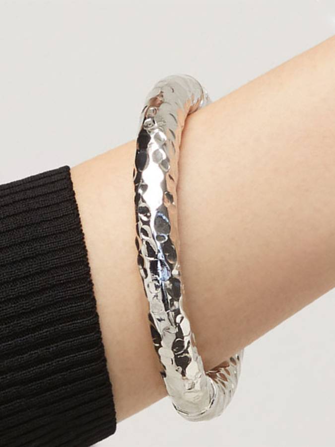 La linea STONE ha una texture che si ispira alla superficie della pietra grezza. Sono gioielli molto luminosi, lucidi e riflettono molto la luce. Il bracciale medio ha una struttura di 10 mm di diametro. La misura è unica e il bracciale si apre a molla.