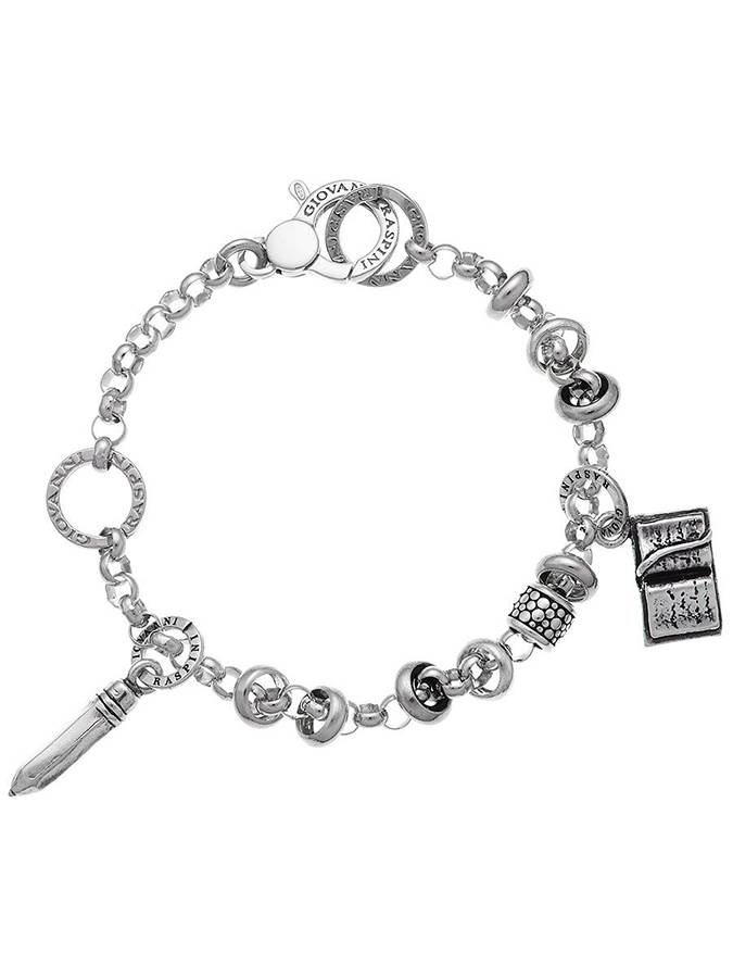 E´ un bracciale della linea Roulette di Raspini, una linea di gioielli da comporre come si preferisce. Qui, sulla catena base abbiamo diversi "roulettini" a ciambellina,unna matita e un libro. Possono essere aggiunti altri elementi fino ad avere un bracciale pieno.