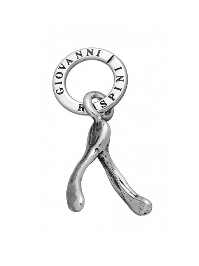 Charm che rappresenta l´osso ( forcella di pollo) dei desideri, lungo cm 1.8 esclusa la maglia di aggancio rotonda e logata.