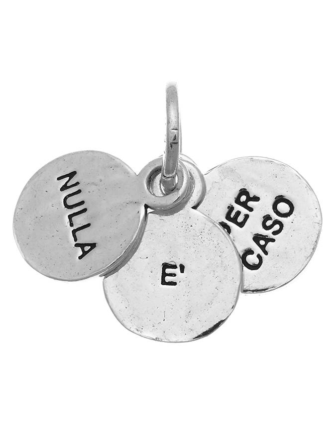 E´ un simpatico charm formato da tre medagliette che riportano scritte diverse. In questo si legge NULLA E´ PER CASO. Le monetine hanno un diametro di cm. 1.2. collegate con la maglia rotonda con logo Raspini di cm. 0.9