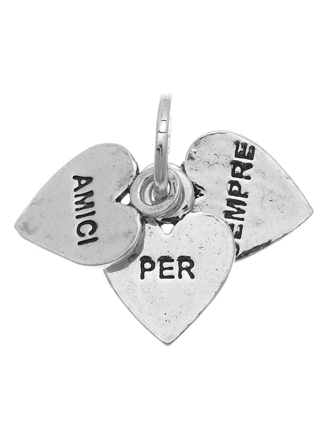 E´ un simpatico charm formato da tre medagliette a forma di cuore che riportano scritte diverse. In questo si legge AMICI PER SEMPRE. Le monetine hanno un diametro di cm. 1.2. collegate con la maglia rotonda con logo Raspini di cm. 0.9