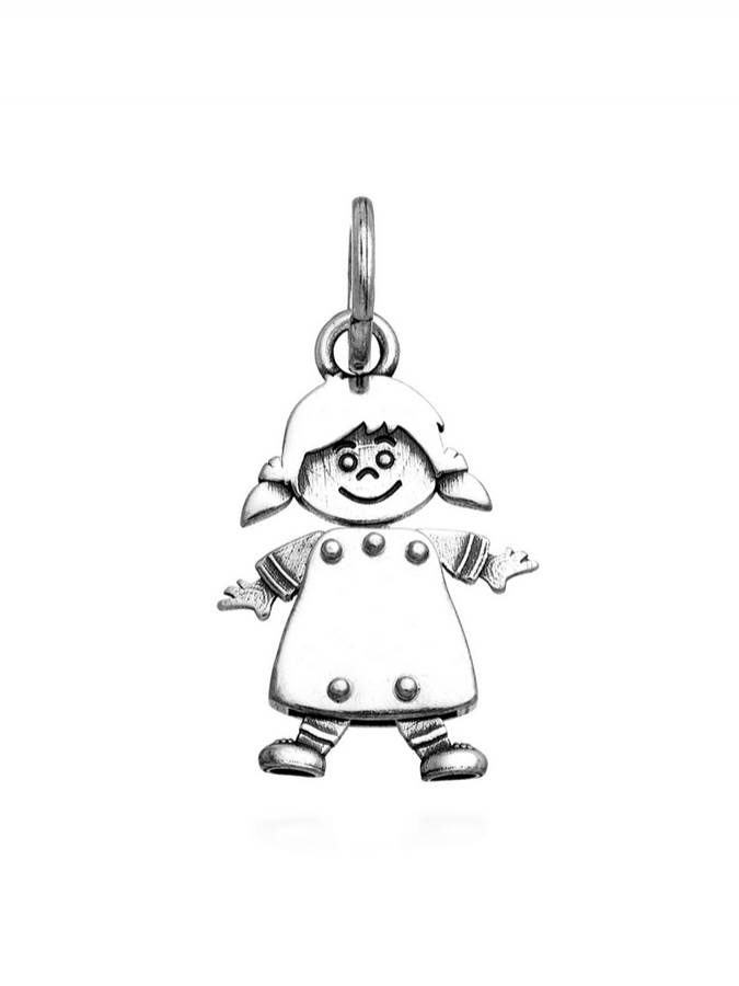 E´ un charm simpatico perché raffigura una bambina con le gambe e le braccia snodate. E´ lungo cm. 2.4 senza la maglia logata di aggancio.
