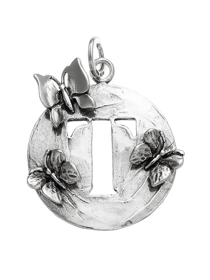 Questa linea di pendenti è bellissima. Il medaglione ha un diametro di 3.5 cm con delle deliziose farfalle che volano anche oltre il bordo e una lettera traforata al centro. La lavorazione è molto accurata.