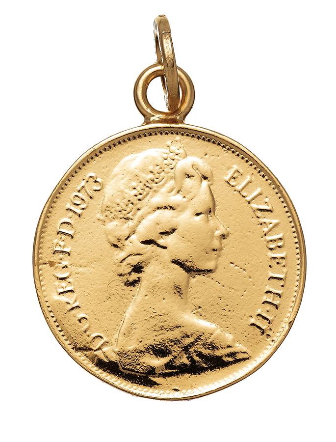 Pendente/moneta da 10 pence inglese che raffigura da un lato la Regina Elisabetta e dall´altro il leone incoronato. In argento 925 galvanizzato in oro giallo, misura 2.5 cm di diametro.