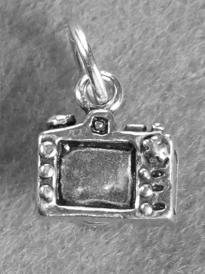 Questo charm raffigura una piccola macchina fotografica lavorata minuziosamente nei suoi dettagli. Misura in lunghezza 1.3 cm. senza la maglia rotonda e logata di aggancio.