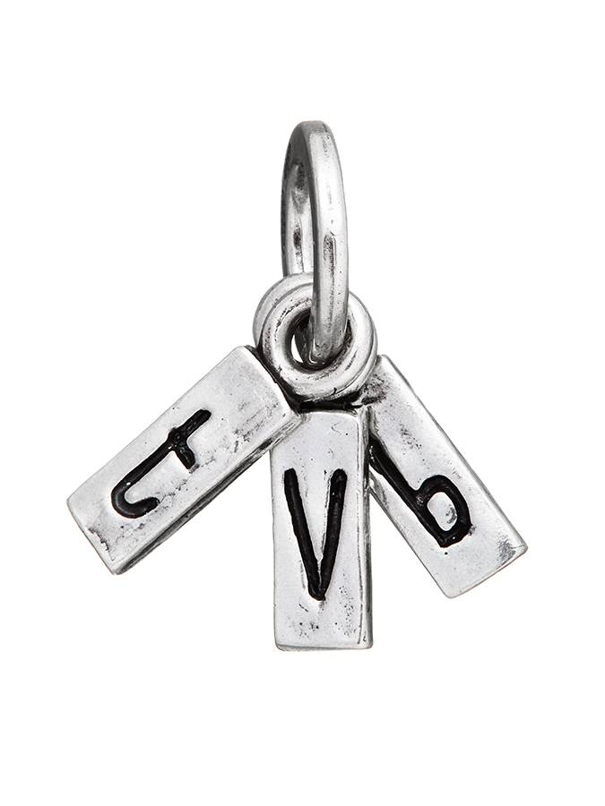 Piccolo charm formato da tre barrette con scritto TVB con una lettera su ciascuna. E´ lungo cm 1,3 compresa la maglina saldata ed esclusa quella rotonda e logata di aggancio.