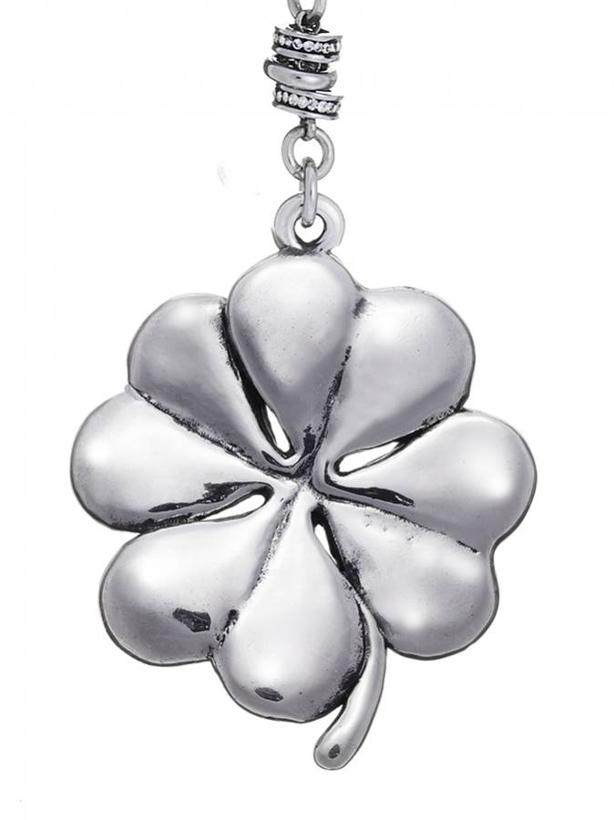 Collana con catena a maglie rotonde martellate in stile tipico fiorentino, con pendente lucido a forma di quadrifoglio. Rondelline luccicanti collegano il pendente alla catena lunga 90 cm. Gioiello fuori produzione.