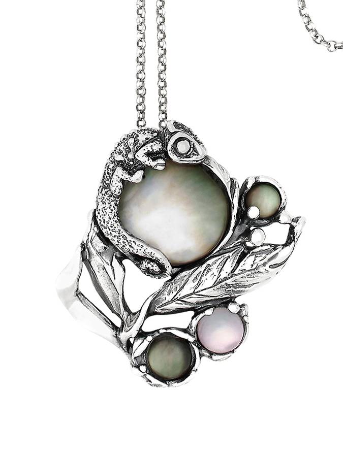 Un camaleonte avvolge con grazia il castone principale, contornato da altri elementi naturali. Quattro gemme in taglio cabochon impreziosiscono questo gioiello: una grande madreperla grigia doppiata con quarzo, affiancata da altre due gemme dello stesso tipo, ed una madreperla rosa.il pendente misura cm 4.8 e la catena cm. 80