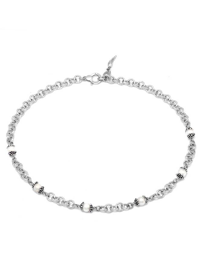Delicate perle di acqua dolce, incastonate da luminose sferette in argento brunito, sono le protagoniste di questa collana. Gli inserimenti in catena martellata offrono matericità al gioiello, che viene realizzato completamente a mano in azienda. Lunghezza cm 45.