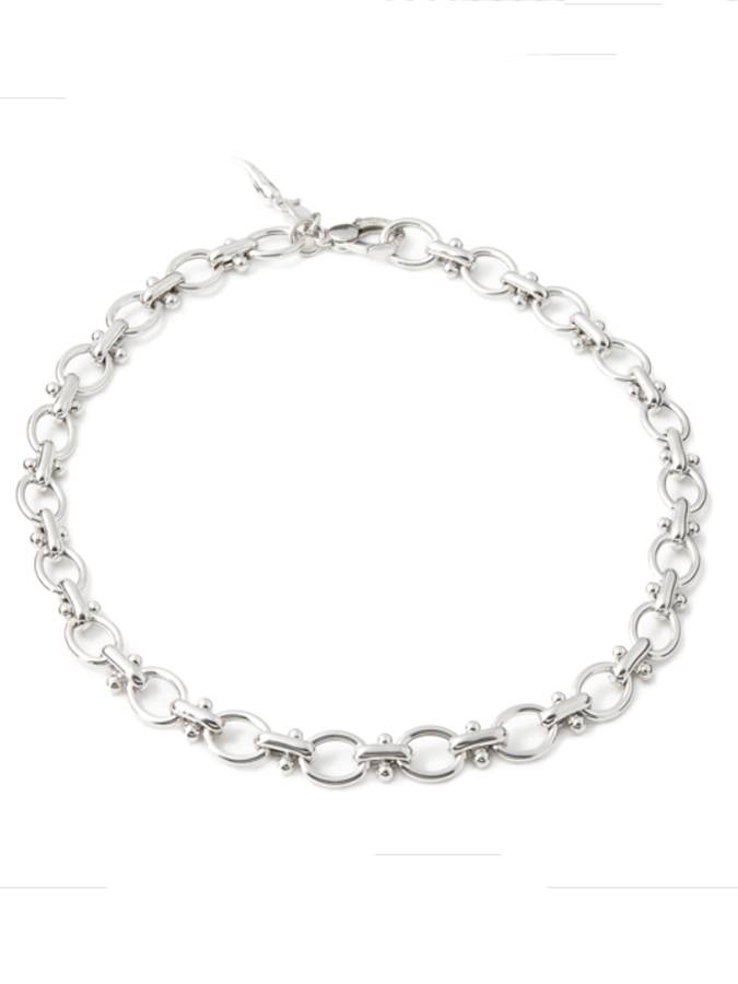 Collana a catena, classica e allo stesso tempo definita da insoliti particolari. E´ lunga 42 cm.