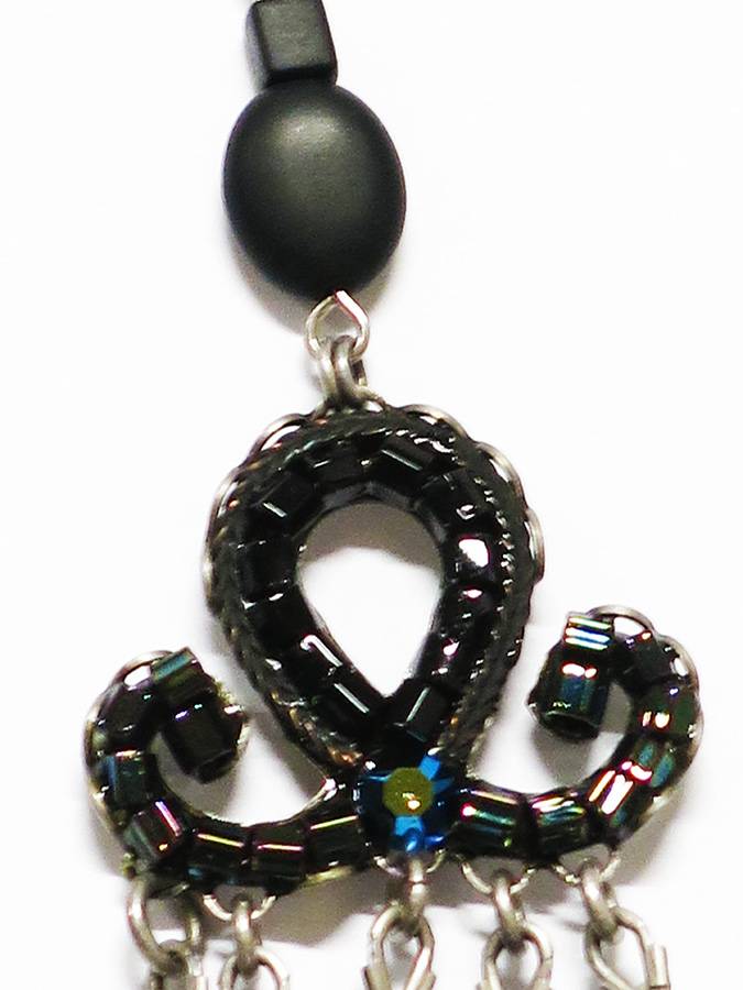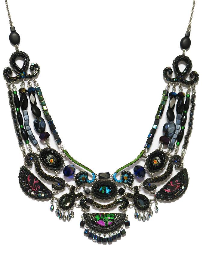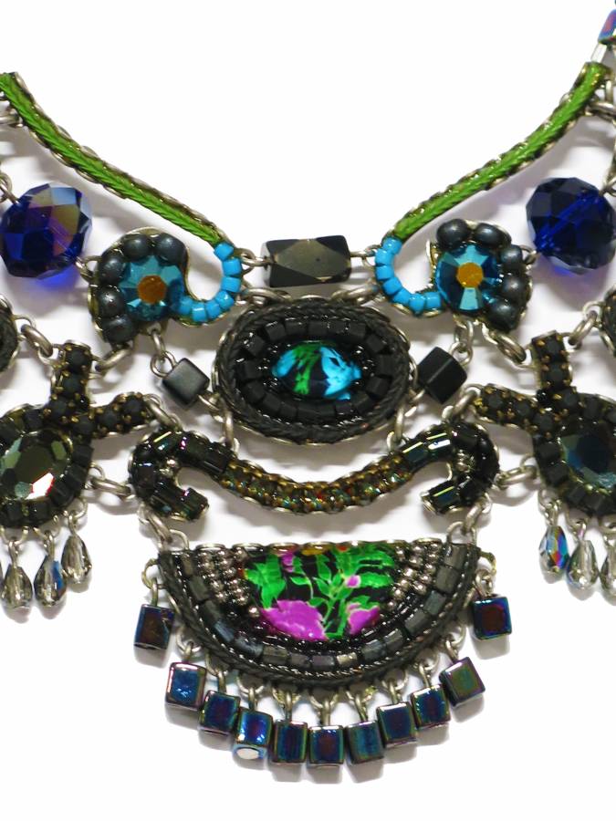 Ecco un´altra spettacolare collana nera che ha il sapore della Belle Epoque. E´ molto luccicante e colorata nelle piccole teche di cristallo sfaccettato che racchiudono stampe floreali su tessuto Le foto si riferiscono al gioiello che verrà spedito e non sono perciò foto da catalogo.