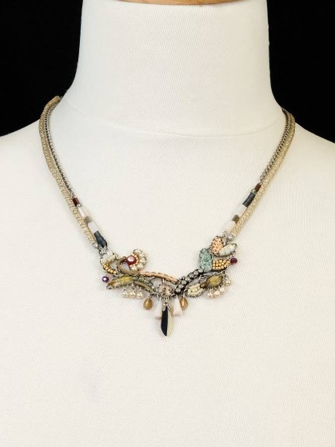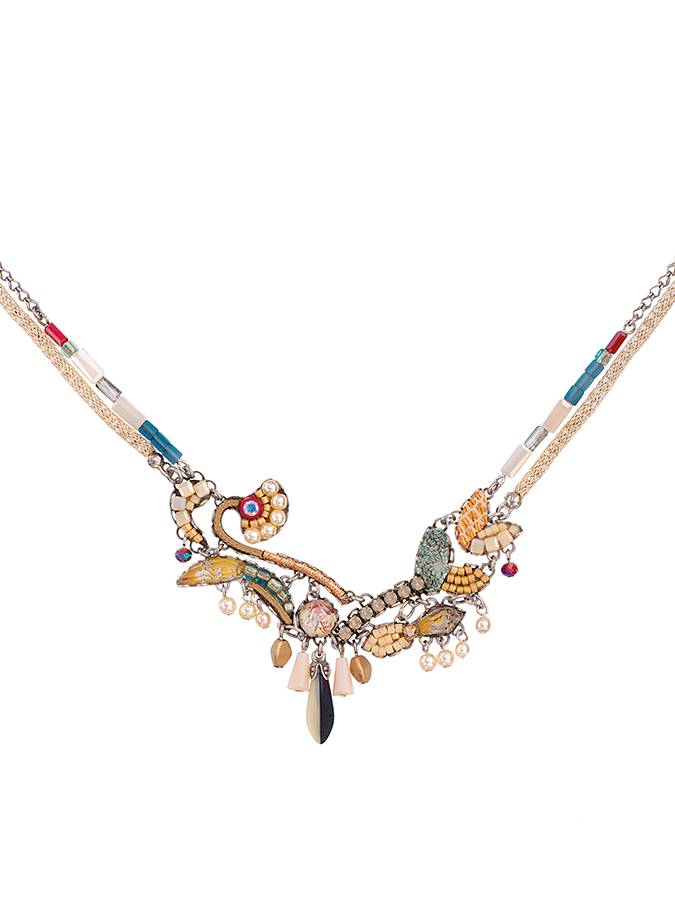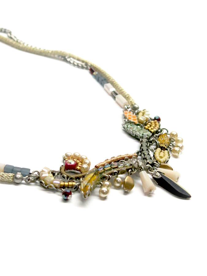 Collana girocollo in toni naturali, con perline, passamaneria e strass. EŽ un girocollo da portare appena sceso, molto elegante.