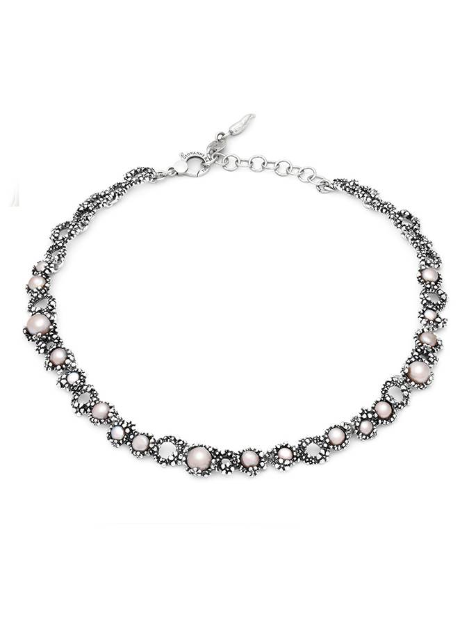 Un motivo floreale, realizzato in argento fuso a cera persa e poi brunito, sprigiona riflessi preziosi grazie alla diamantatura eseguita a mano, esalta la bellezza di perle d’acqua dolce dalle delicate sfumature rosa. Lunghezza cm. 45