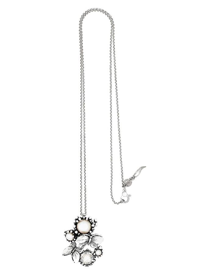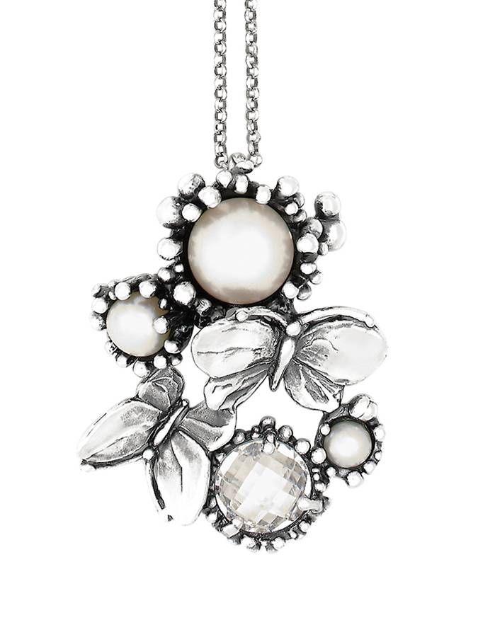 In questo elegante pendente in argento fuso e quindi brunito, un decoro primaverile, caratterizzato da due farfalle finemente modellate a mano con altri elementi naturalistici, fa da elegante castone a quattro gemme: tre perle ed un bellissimo zircone tondo sfaccettato. Completa il pendente una catena micro rolò diamantata da 80 cM. Il pendente da solo misura 5 cm.