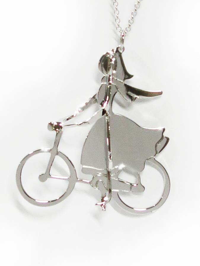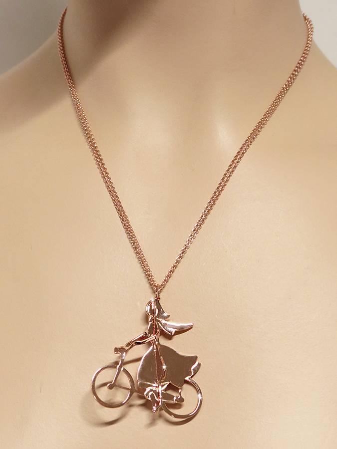 Pendente che raffigura una ragazza in bicicletta. Ha una catena di 90 cm e può avere galvanica di finitura in oro rosa, oro giallo o rodio.