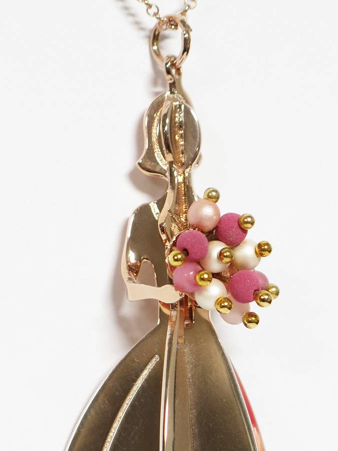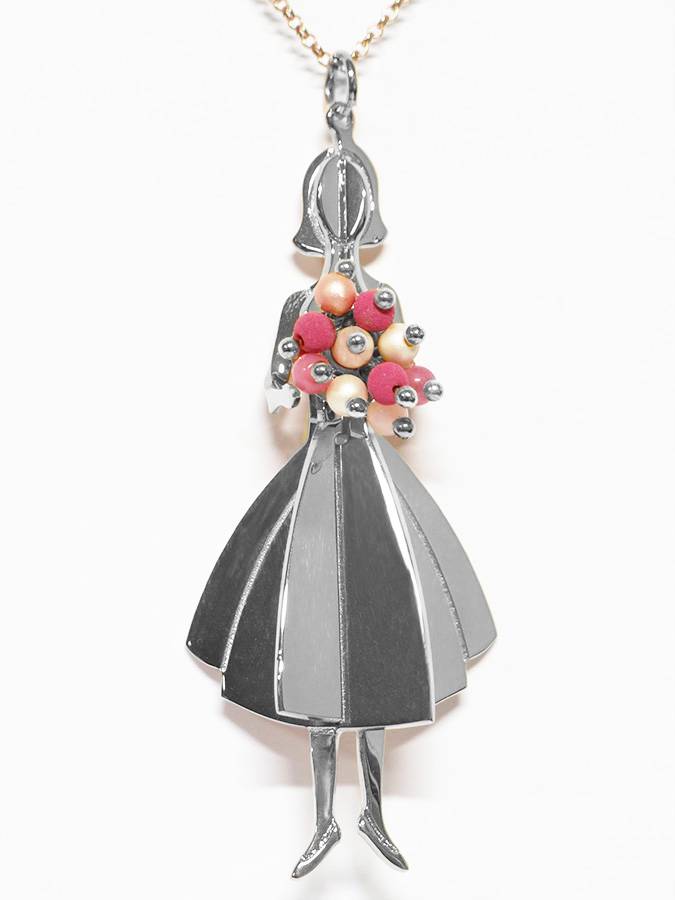 E´ deliziosa questa ragazza con i fiori in mano. Questo pendente ricorda le spille americane d´epoca che seguivano la moda del momento. Molto spiritoso e divertente, questo gioiello dona femminilità a chi lo indossa.