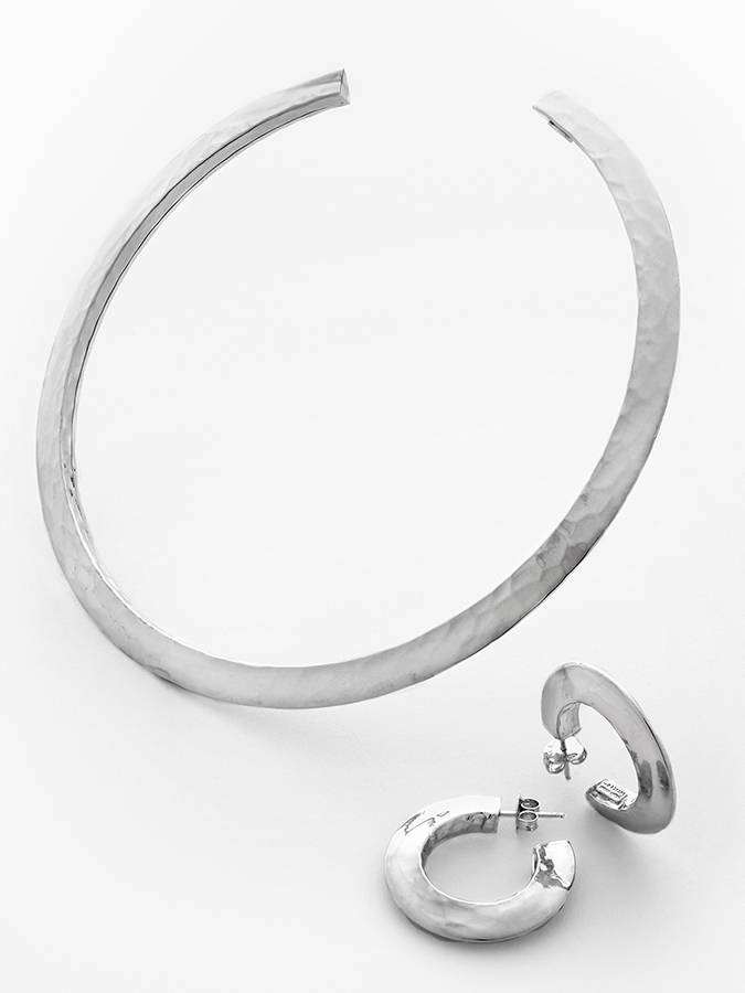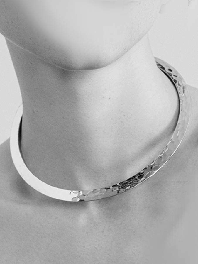 E´ una collana stilizzata, rigida, dall´insolita sezione triangolare e molto elegante, E´ un oggetto di geniale design, perfetta sia con abbigliamento informale sia con un vestito da sera,