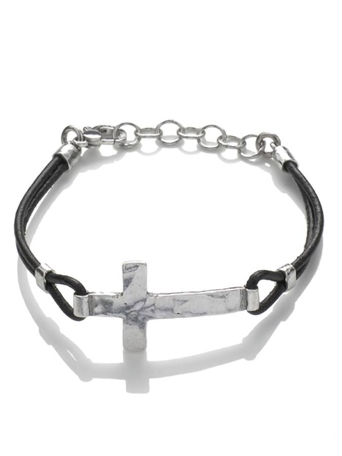 Bracciale in argento 925 e cordino di cuoio nero di 2 mm con una croce centrale che misura 3,5x2 cm. Il bracciale è lungo cm. 22 compresa la catenina di allungo.