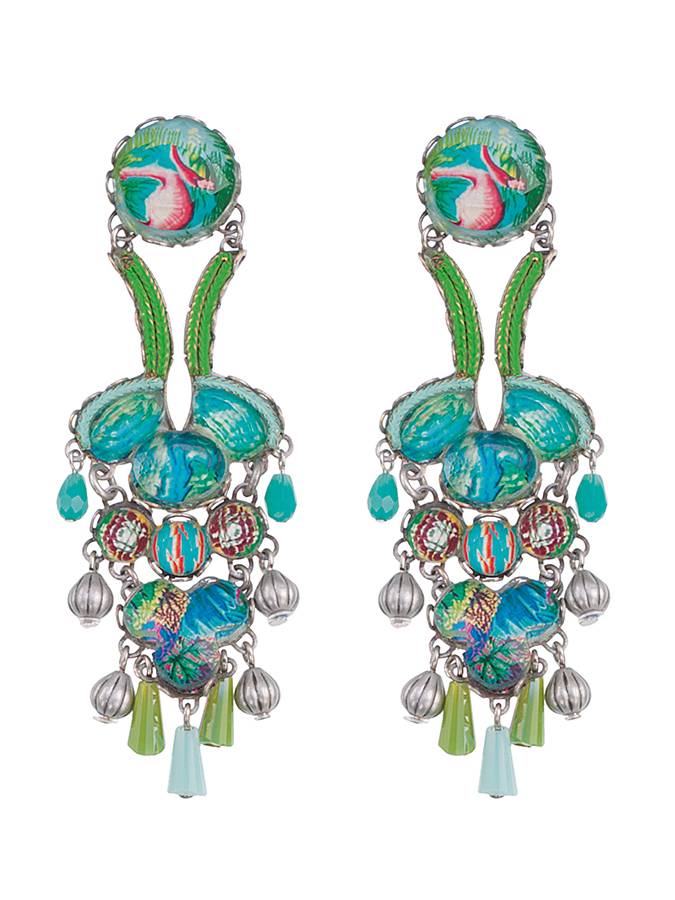 Realizzati nei toni dal turchese al verde, con qualche accenno al rosa dei fenicotteri, questi orecchini sono molto decorativi anche se non lunghissimi. (cm.7.5). Sono molto raffinati.