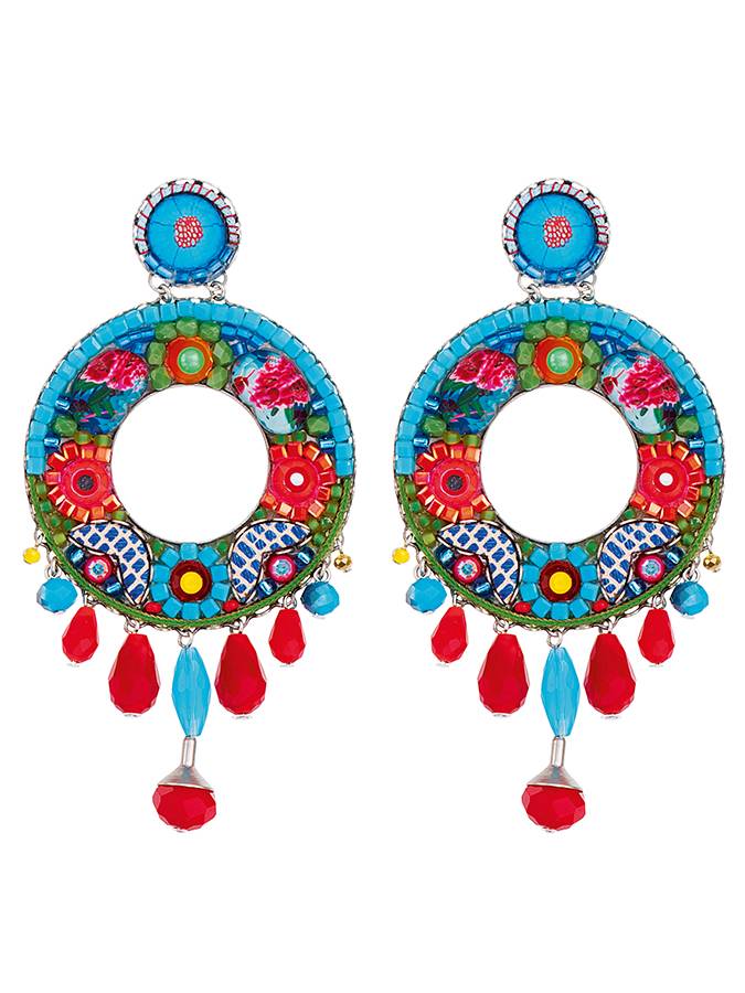 Orecchini bellissimi sui toni del rosso e del turchese, luccicanti e luminosi, da indossare in estate o anche in inverno su abbigliamento monocolore. Sono lunghi complessivamente cm. 8.5