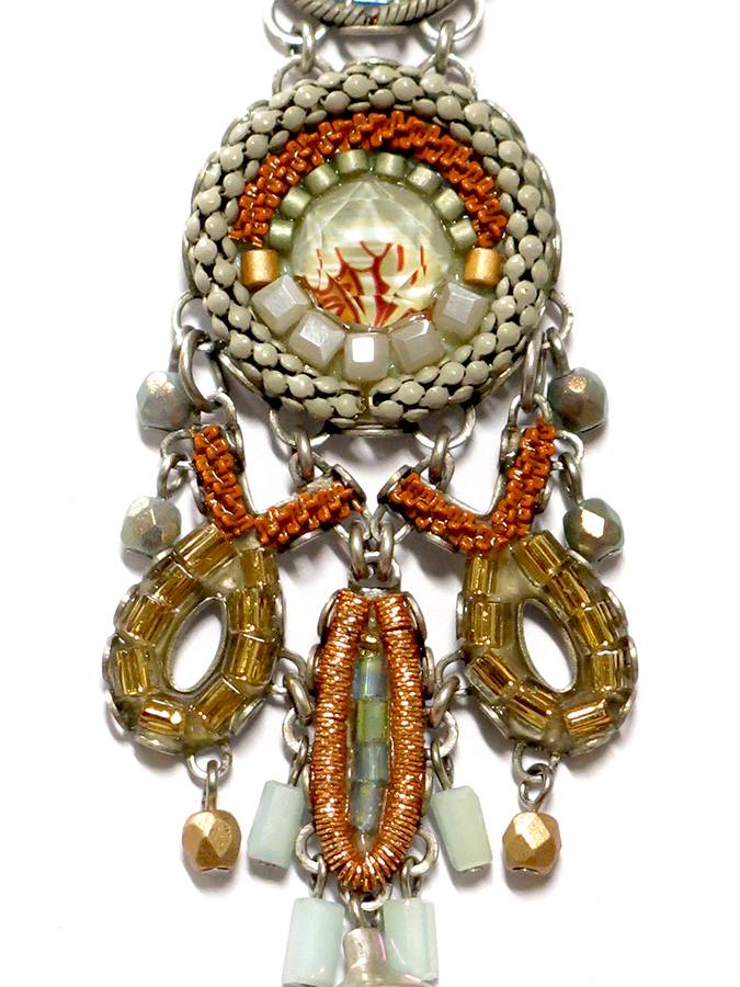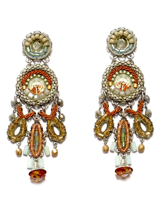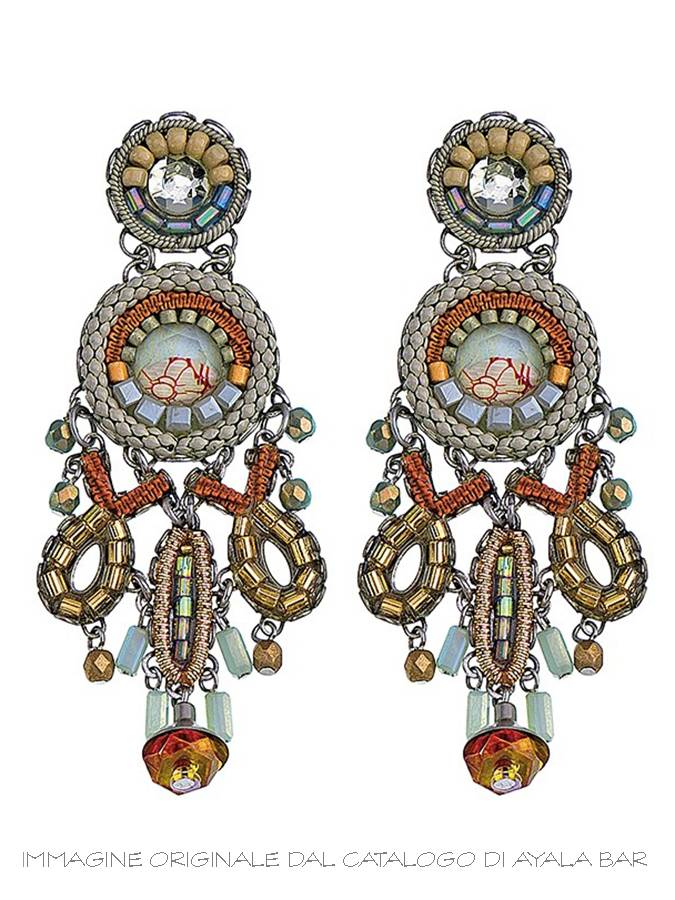 Orecchini dai toni neutri, lavorati sapientemente a mano con passamanerie, cristalli, conterie veneziane. Sono lunghi cm.6.5 e si indossano praticamente con tutto.