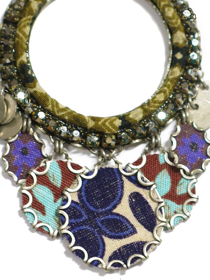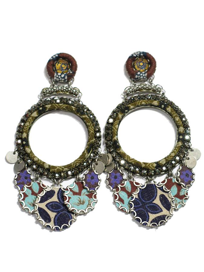 Questi orecchini sino scuri ma molto luccicanti ed eleganti. Sono fatti con cristalli sfaccettati, piccole stampe floreali su tessuto. Sono molto originali e ben lavorati. Le foto sono iscattate al gioiello che riceverete in confezione regalo, nell´astuccio e con garanzia originali Ayala Bar.