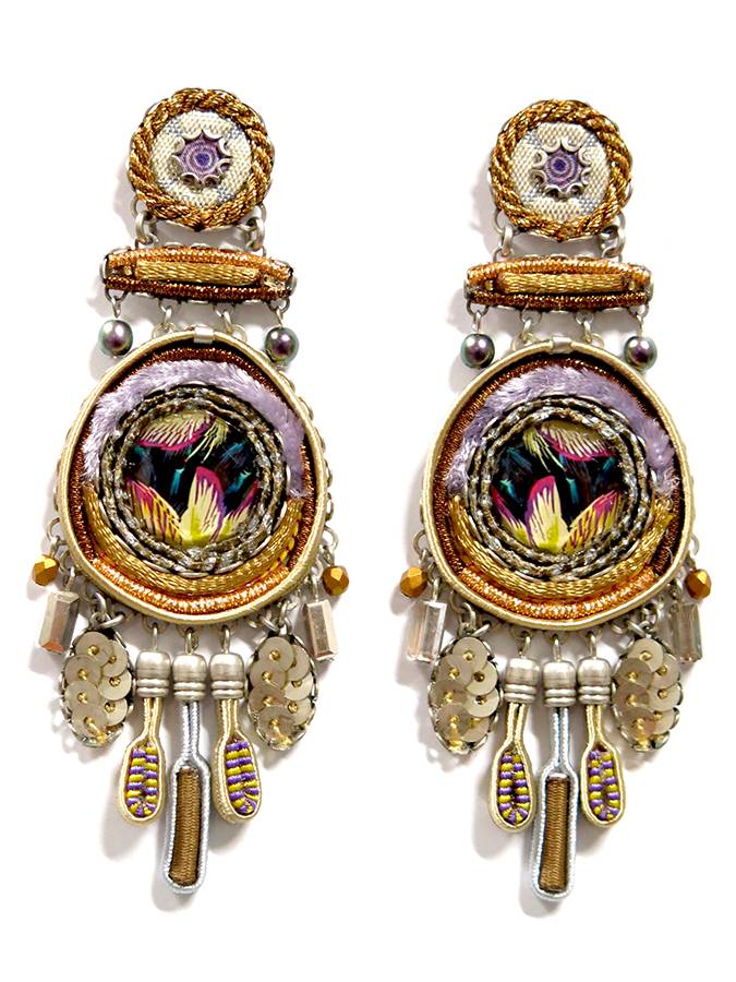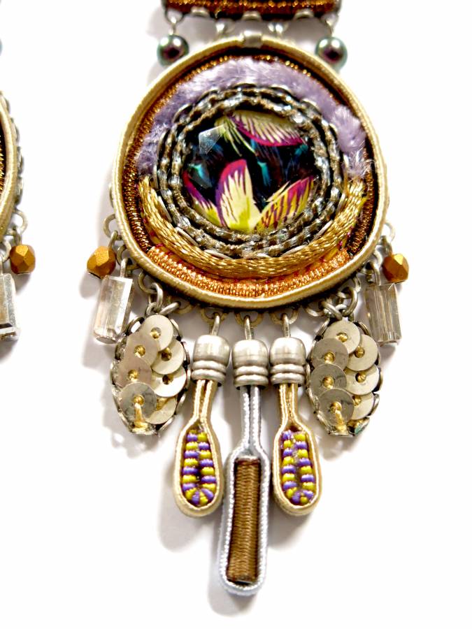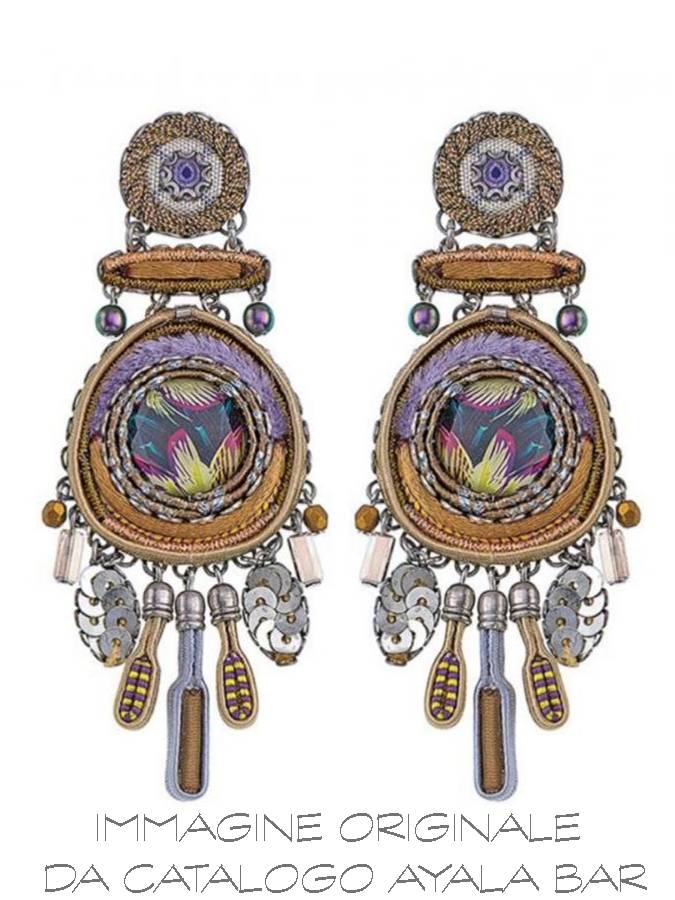 Orecchini spettacolari con eleganti raffinatissimi colori, che hanno elementi in passamaneria finemente lavorati, cristalli e piccole perle. lunghezza cm.9.
