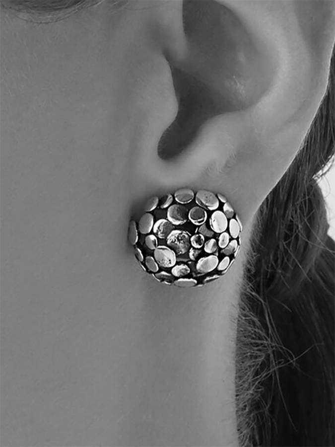 Orecchini a bottone della linea Paillettes, molto luminosi. Sono formati da una mezza sfera e la chiusura è a perno e farfallina. Hanno un diametro di cm. 1.8