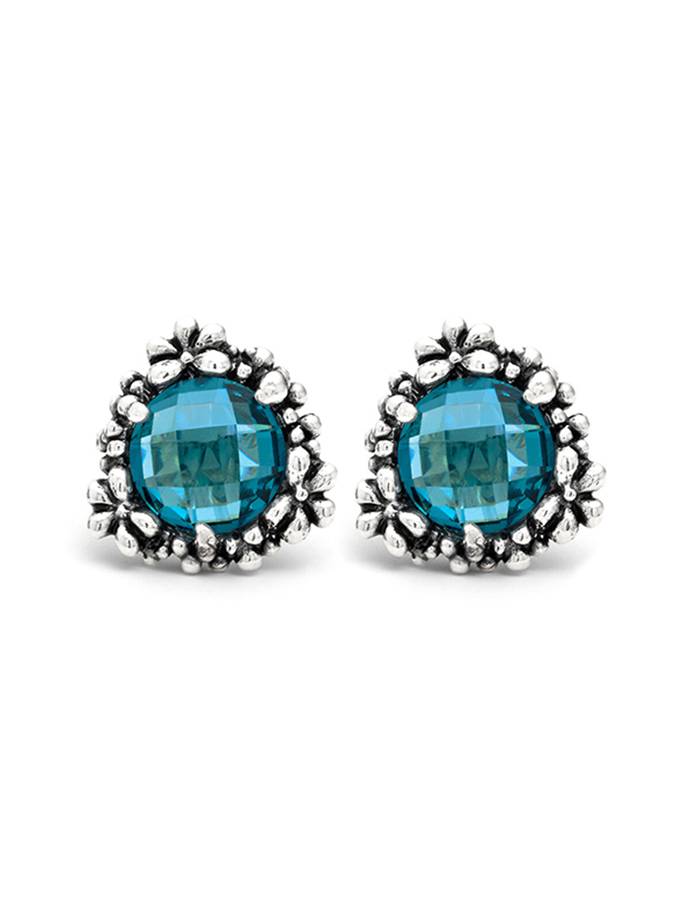 Gli orecchini Blue Ivy Grandi si distinguono per la raffinata combinazione di un grande cristallo rotondo sfaccettato in tonalità celeste e un castone lavorato con la tecnica della fusione a cera persa, ispirato al delicato motivo floreale. Altezza cm. 1.6