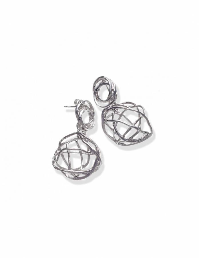 Questi orecchini della linea Intrecci, fuori produzione, sono molto luminosi e leggeri. Sono lunghi 4 cm e la sfera ha un diametro di 2,7 cm.