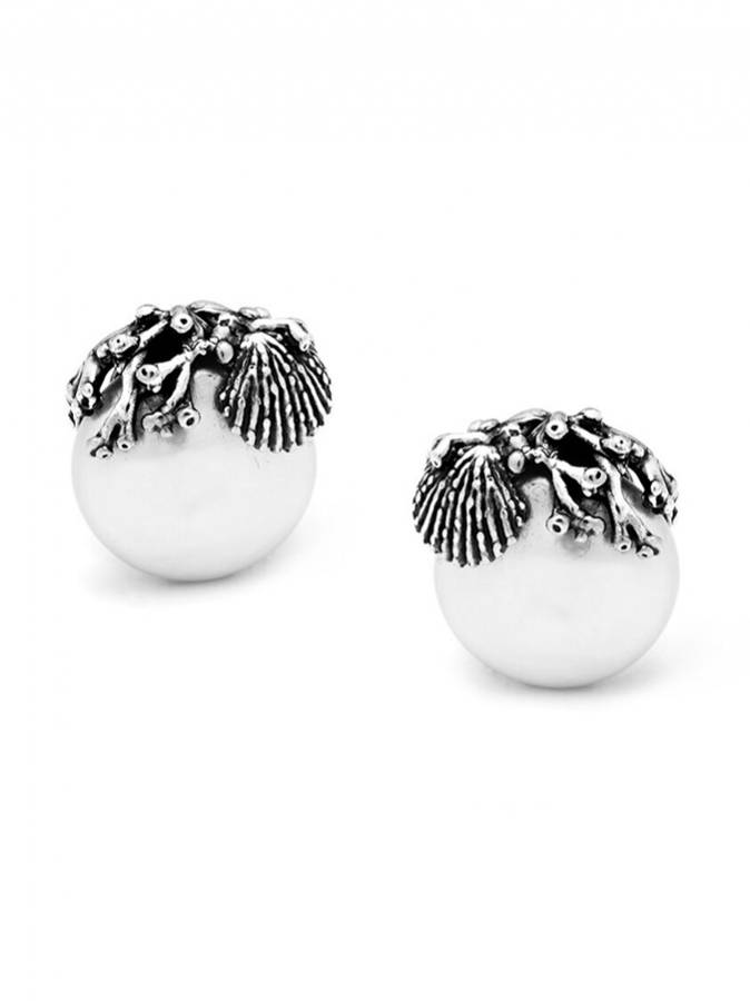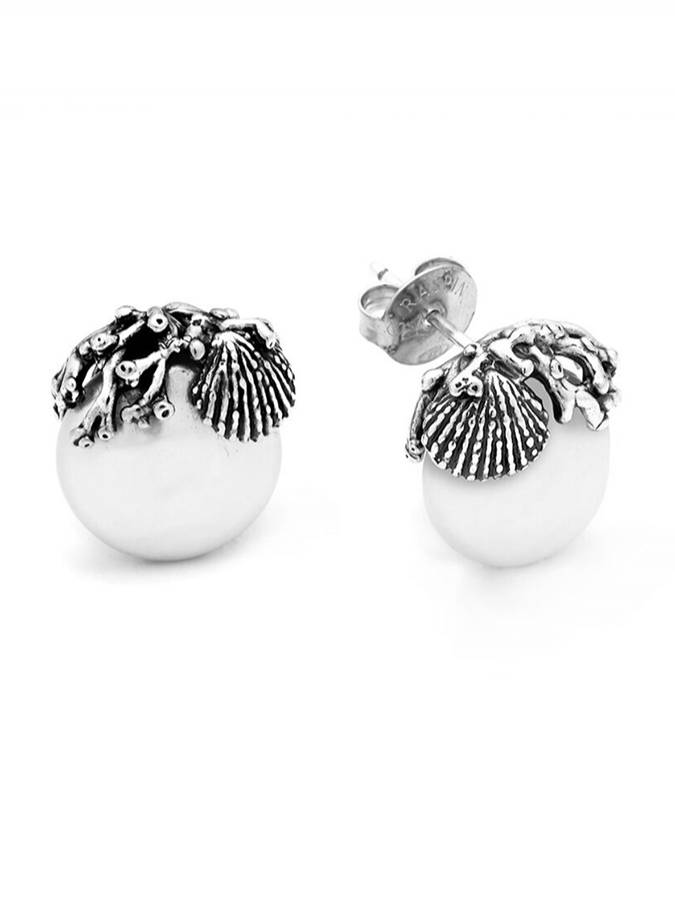 Orecchini a lobo con perla di acqua dolce a forma di disco con decori dal sapore di mare.