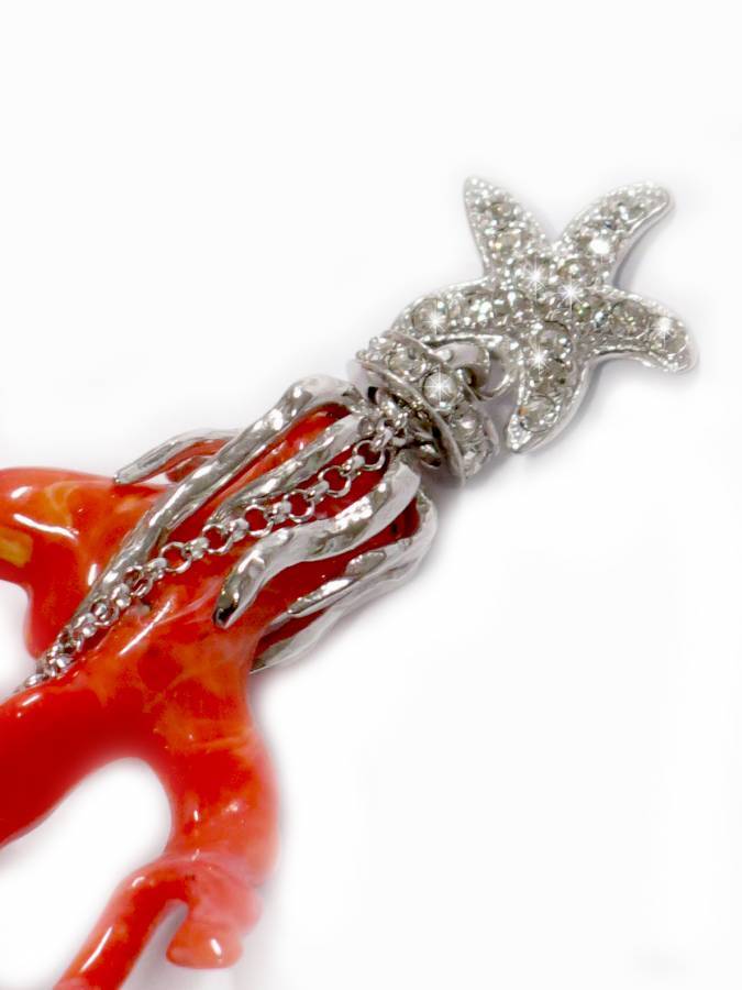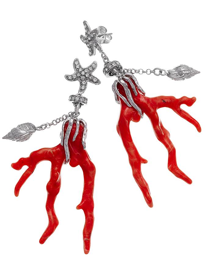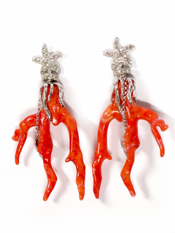 Bellissimi orecchini con rami di corallo in resina e stelle marine di zirconi al lobo. Sono lunghi cm. 8. Gioiello fuori produzione.