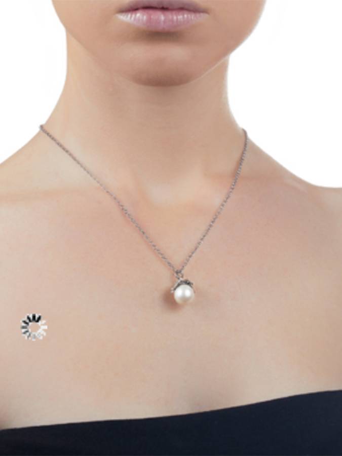 Un nugolo di piccole api lavora all´alveare appoggiato su una bella perla di acqua dolce. La collana è lunga 45 cm.