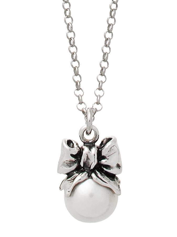 E´ delizioso questo fiocco che sorregge una bella perla di acqua dolce. La collana misura cm. 45.