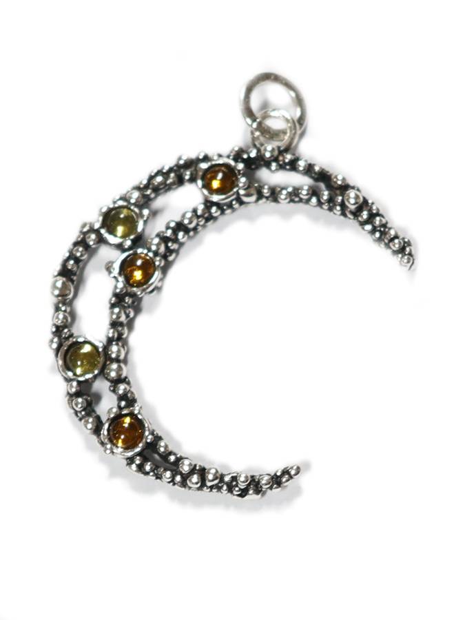 Pendente a forma di luna, con lavorazione perlage e pietrine cabochon color giallo citrino chiare e scure. E´ largo cm.4 e alto cm 5.5 compresa la maglia logata di aggancio.