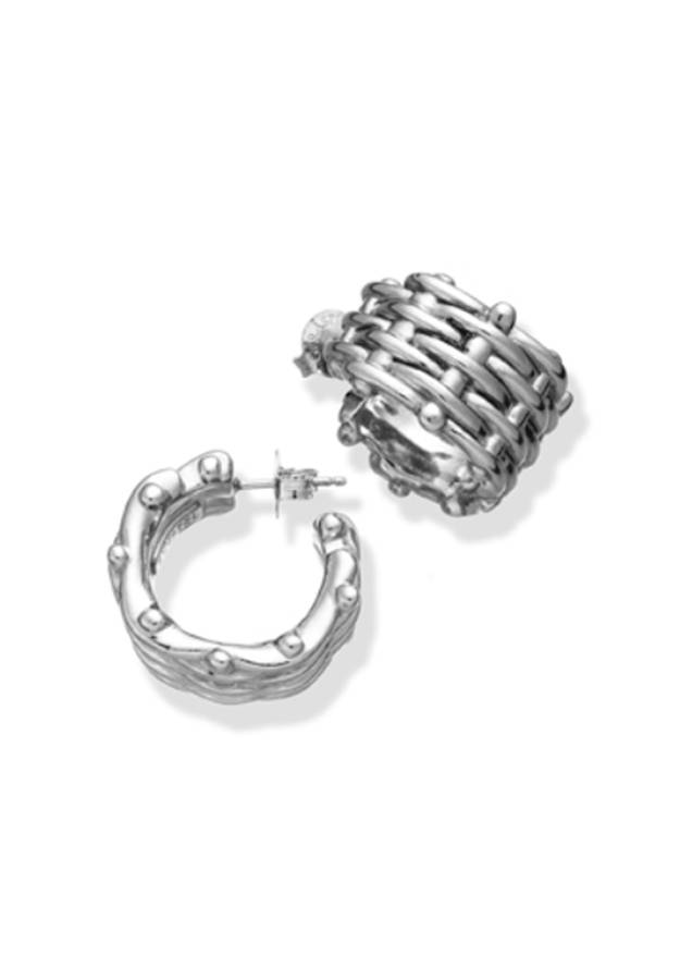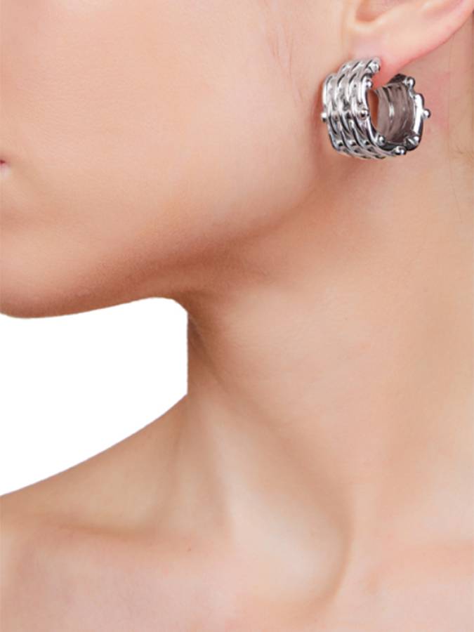 Sono orecchini a lobo afoprme di cerchietto intrecciato, sono leggerissimi e luminosi e hanno un diametro di 2,6 cm.