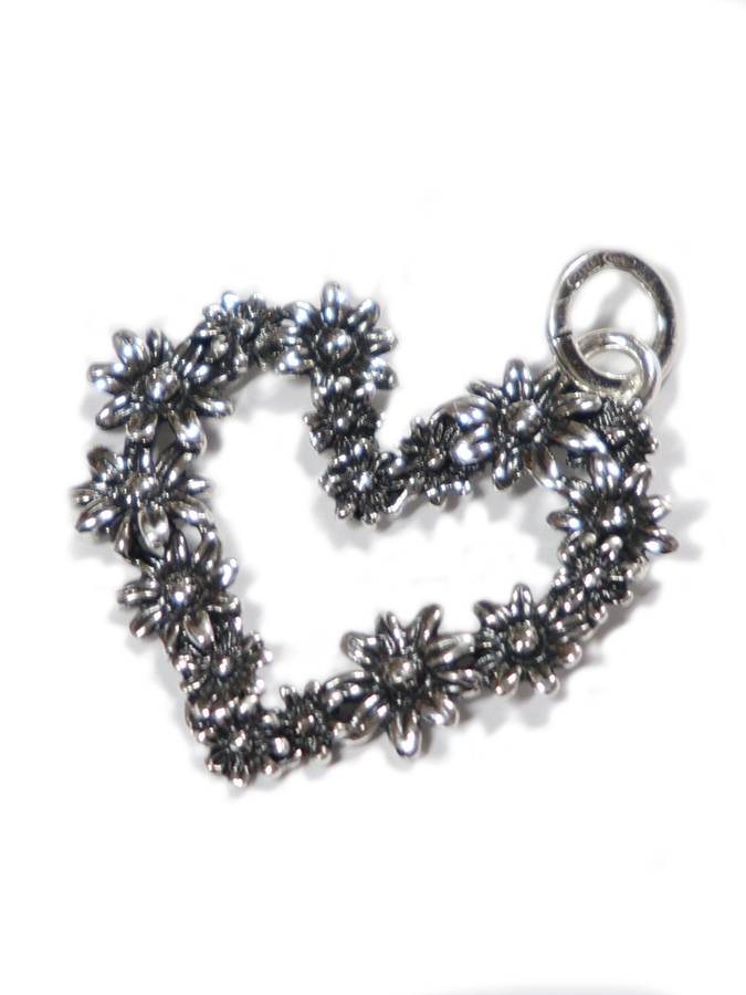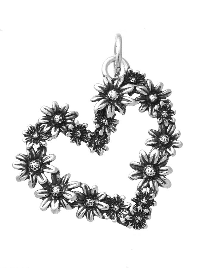 Un prato di margherite forma questo cuore pendente che fa parte di una serie di quattro pendenti con decorazioni diverse. Misura cm 3.6 in larghezza e 4.5 in altezza compresa la maglia rotonda logata di aggancio.