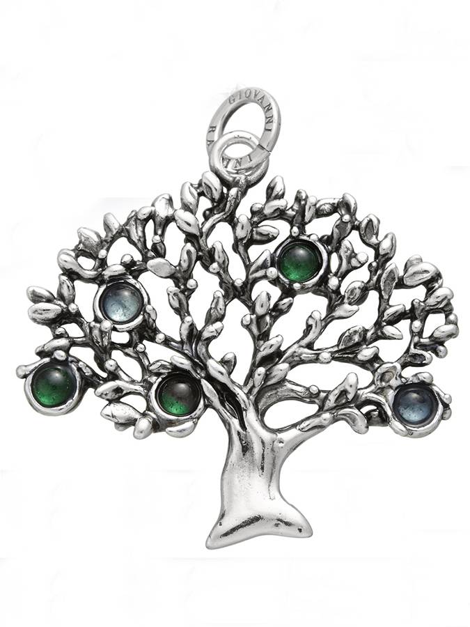 Pendente a forma di albero della vita, fatto bene e molto curato con pietrine cabochon color verde smeraldo.Il pendente misura cm 4.5 in larghezza e cm. 4.8 in altezza compresa la maglia logata di aggancio.
